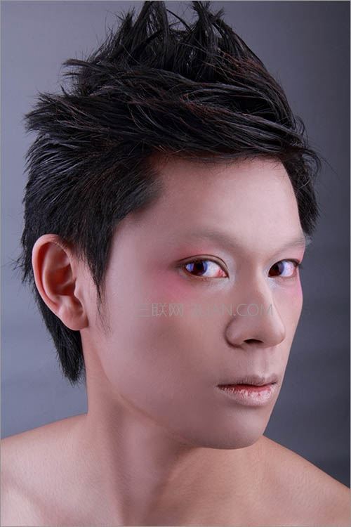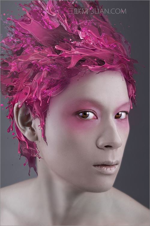 因此作品创作需要,磨皮可以尽量光滑,尤其是减弱眉毛的浓度,使其变得稀薄,达到“超人类”的感觉。对五官和面部轮廓进行液化修饰,改善颧骨与下巴间过于瘦削的脸颊线条,达到视觉流畅感。