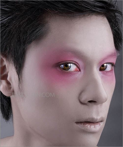 4、用R120,G60,B80的颜色在新的图层上以边缘渐变模糊的笔触加强眼部周围的熏染,(使用画笔工具,在菜单下方“画笔预设内”选择边缘羽化的笔触,即硬度为0,大小可根据眼眶大小调整)图的合成方式为“叠加”,生成此图层的蒙版,遮住眼睛内部的熏染,露出完整的眼眶、眼黑、眼白。
