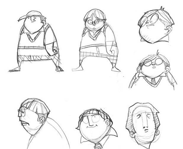 我被要求设计两个角色,灵感来自于Highlights漫画杂志上的一部老漫画Goofus and Gallant。 一个角色态度傲慢和叛逆,另一个角色应该是厚脸皮的老师的走狗,但两个角色都必须很时尚。我决定,我将把一个积极的方法来设计图形,所以我的角色的参考是引用Jamie Hewlett的角色和电影Coraline还有Open Season。我有这个想法,他们是完全不同的,所以我试图让每个人物的每一个元素不同于其他角色。我做了一些设计草图,如下所示。