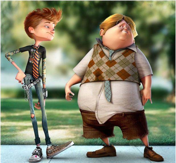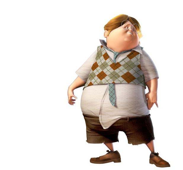 麦克斯(Max)的设计是基于一个棒棒糖的形状。他瘦得皮包骨,傲慢的脸,小躯干高又瘦,裤裆上有很大的腰带装饰,手、脚都很突出。他给人的感觉就是“我不在乎”的风格,我猜想他这个造型,每天早上得花几个小时才能弄出来。弥尔顿(Milton)的设计是基于一个三角形。他的头很大很宽,面部五官却是小的。他的身体比较大,胯部较低,有胖胖的手和脚。他的设计是应该可以暗示他还是由他妈妈买衣服,决定在他的发型,但是他经常把衣服扔在地板上或者床边。