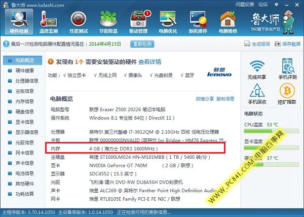 如上图,在硬件检测中,就可以看到笔者电脑内存型号为:4GB 海力士DDR3 1600 内存。