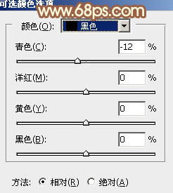3、创建可选颜色调整图层,对黄、绿、黑进行调整,参数设置如图6 - 8,效果如图9。这一步给图片增加橙黄色。