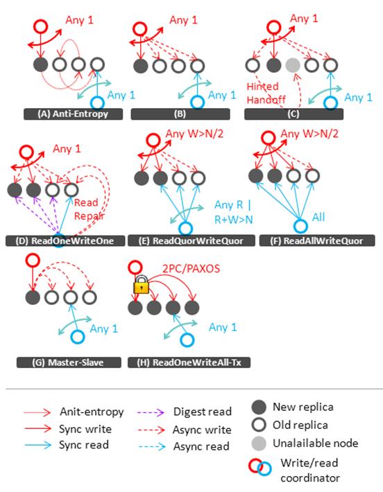 (H, Transactional Read Quorum Write Quorum and Read One Write All) 更新多个副本的方法可以通过使用事务控制技术来避免写冲突。 众所周知的方法是使用两阶段提交协议。但两阶段提交并不是完全可靠的,因为协调者失效可能会造成资源阻塞。 PAXOS提交协议 [20, 21] 是更可靠的选择,但会损失一点性能。 在这个基础上再向前一小步就是读一个副本写所有副本,这种方法把所有副本的更新放在一个事务中,它提供了强容错一致性但会损失掉一些性能和可用性。