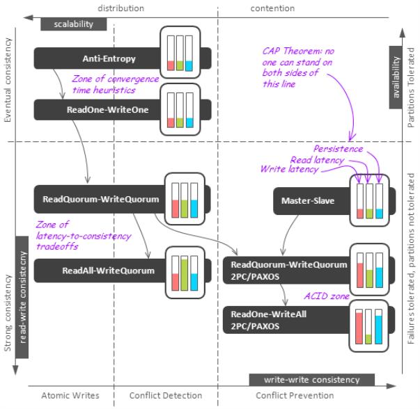 众所周知,分布式系统经常会遇到网络隔离或是延迟的情况,在这种情况下隔离的部分是不可用的,因此要保持高可用性而不牺牲一致性是不可能的。这一事实通常被称作“CAP理论”。然而,一致性在分布式系统中是一个非常昂贵的东西,所以经常需要在这上面做一些让步,不只是针对可用性,还有多种权衡。为了研究这些权衡,我们注意到分布式系统的一致性问题是由数据隔离和复制引起的,所以我们将从研究复制的特点开始:
