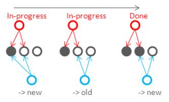 其次,因为R+W>N,写入的节点和读取的节点之间必然会有重叠,所以读取的多个数据副本里至少会有一个是比较新的数据(上面的图中 W=2, R=3, N=4 )。这样在读写请求依序进行的时候(写执行完再读)能够保证一致性(对于单个用户的读写一致性),但是不能保障全局的读一致性。用下面图示里的例子来看,R=2,W=2,N=3,因为写操作对于两个副本的更新是非事务的,在更新没有完成的时候读就可能读到两个都是旧值或者一新一旧: