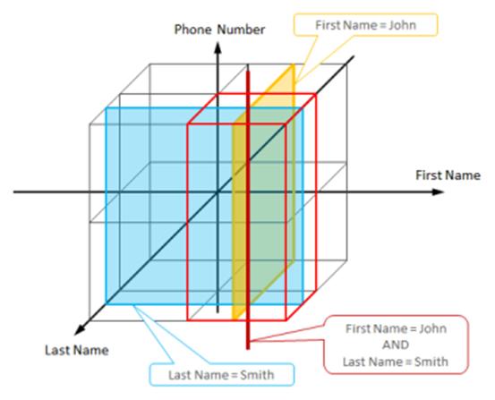 每一条数据都是一条用户信息,有三个属性First Name 、Last Name 和Phone Number。这些属性被视作一个三维空间,可行的数据分布策略是将每个象限映射到一个物理节点。像“First Name = John”这样的查询对应到一个贯穿4个象限的平面,也即只有4个节点会参与处理此次查询。有两个属性限制的查询对应于一条贯穿两个象限的直线,如上图所示,因此只有2个节点会参与处理。