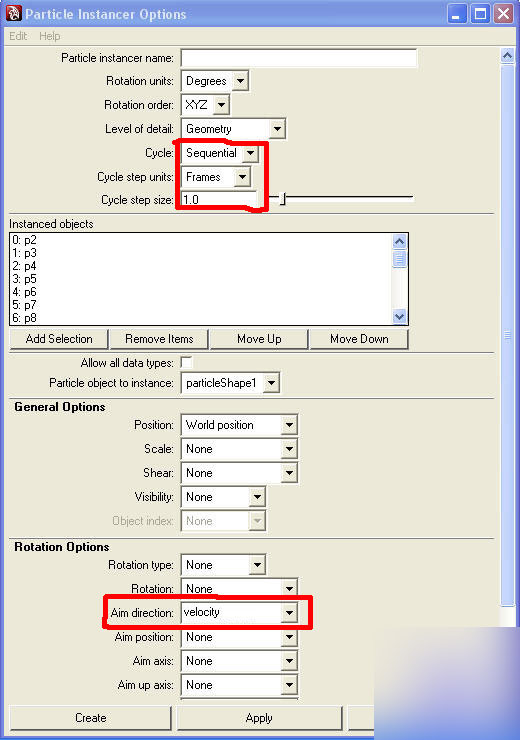 4.选中所有复制的角色,选择 particle => instancer option,editor => reset settings,如下设置参数。