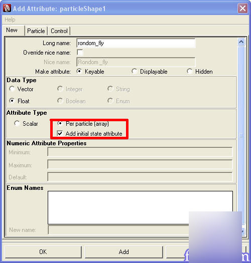 点击 Add 添加。在 Per Particle(Array)Attribute 子面板中,右键点击 random_fly,选择 create expression