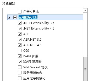 本文是以IIS 8.0为例,也适用于IIS 7.0/7.5/8.5版本,但不适用IIS 6.0版本,6.0版本对.NET框架的支持与设置和以后版本有很大区别。我们在安装IIS 8.0的时候,需确保已安装以下应用程序开发模块。