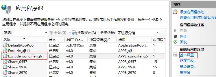 打开应用程序池,选择要调整的程序池,再点击右侧操作栏上的“基本设置”。
