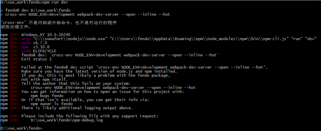 'NODE_ENV' 不是内部或外部命令,也不是可运行的程序或批处理文件。npm ERR! Windows_NT 6.1.7601npm ERR! argv "D:\nodejs\node.exe" "D:\nodejs\node_modules\npm\bin\npm-cli.js" "start"npm ERR! node v4.0.0-rc.5npm ERR! npm v2.14.2npm ERR! code ELIFECYCLEnpm ERR! yy-ydh-web@1.0.7 start: `npm run clear&& NODE_ENV=development && webpack-dev-server --host 0.0.0.0 --devtool eval --progress --color --profile`npm ERR! Exit status 1npm ERR!npm ERR! Failed at the yy-ydh-web@1.0.7 start script 'npm run clear&& NODE_ENV=development && webpack-dev-server --host0.0.0.0 --devtool eval --progress --color --profile'.npm ERR! This is most likely a problem with the yy-ydh-web package,npm ERR! not with npm itself.npm ERR! Tell the author that this fails on your system:npm ERR! npm run clear&& NODE_ENV=development && webpack-dev-server --host 0.0.0.0 --devtool eval --progress --color --profilenpm ERR! You can get their info via:npm ERR! npm owner ls yy-ydh-webnpm ERR! There is likely additional logging output above.npm ERR! Please include the following file with any support request:npm ERR! D:workspacenode_modulesyy-ydh-webnpm-debug.log