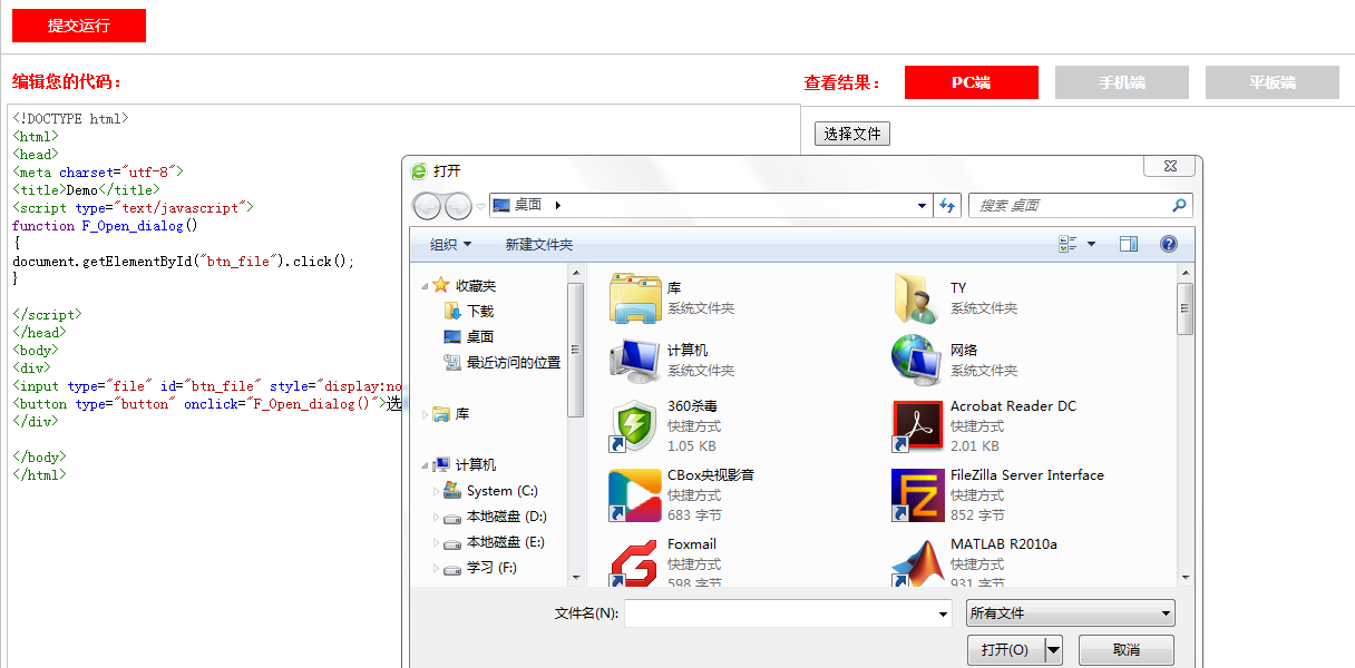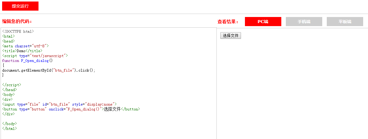 将代码复制到W3CSchool的测试页面,提交运行之后如图:在查看结果页面会出现“选择文件”这个按钮