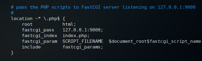 然后配置.php请求被传送到后端的php-fpm模块,默认情况下php配置块是被注释的,此时去掉注释并修改为以下内容: