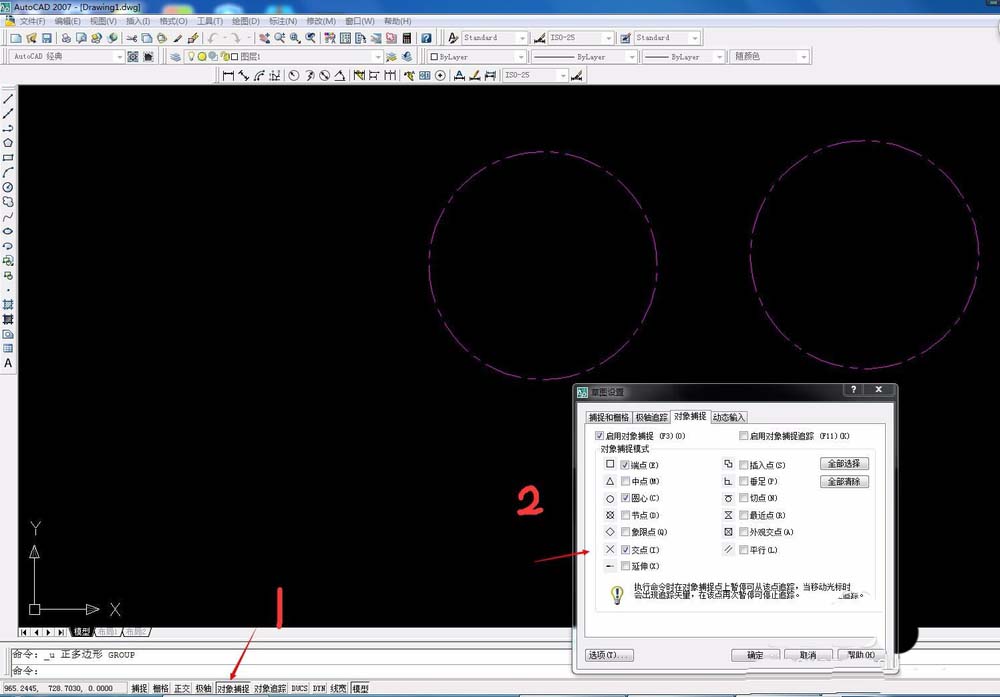 在开始画图之前先画两个半径均为100的圆作为辅助对象,并右击对象捕捉设置对象捕捉对象如下图所示;此步骤是为了很方便的识别捕捉到圆心。