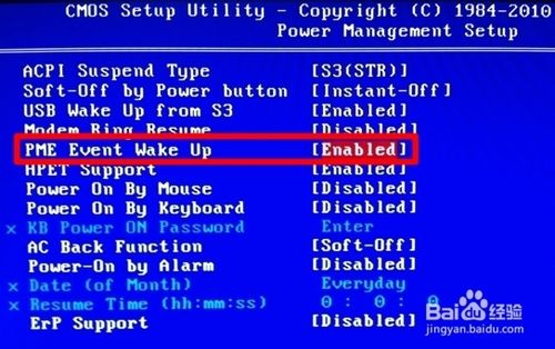 在电源管理菜单中,PME Event Wake up(PME事件唤醒)应为Disable(禁用)即可。