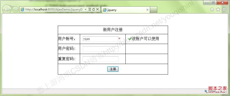 jQuery是时下比较流行的一个js库,能够用简单的代码做出理想的效果,就像官网上说的那样“write less ,do more”。Jquery在一定程度上改写了以往对JavaScript的写法,本人就用jquery实现上篇中用ajax实现异步通信的效果,感受一下jquery的魅力。