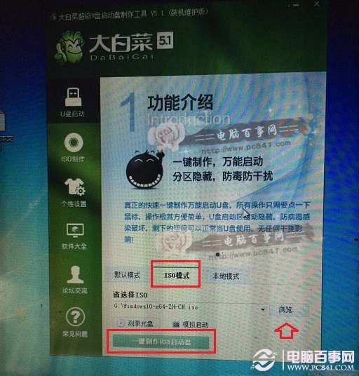 4)打开下载并完成安装的大白菜装机版工具,然后切换到【ISO模式】,然后点击下面的【浏览】,找到打开我们第一步下载的Win10系统镜像,最后再点击【一键制作USB启动】,如下图所示: