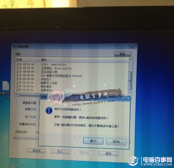 5)等待进度完成之后,会看到制作USB启动成功,并且Win10原本镜像也已经写入到了U盘,这里会提示您是否需要测试一下。其实没必要测试,这里直接点击“否”即可,如下图所示。