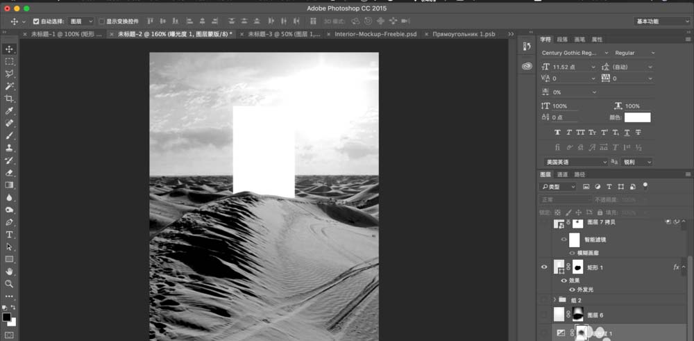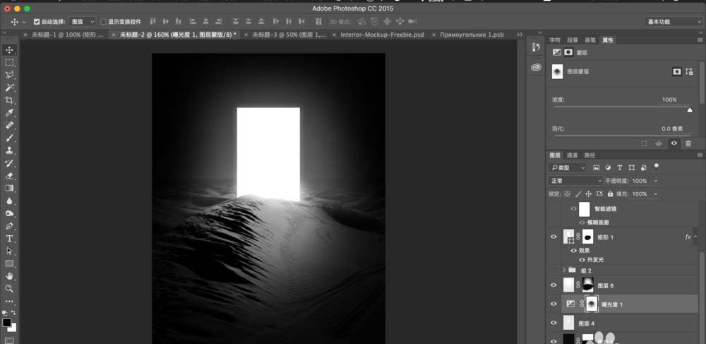 2、接着确定光门的位置,用矩形工具画完用蒙版工具擦去遮盖的部分。给光门增加一丢丢外发光。