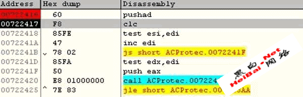 用前面的OllyScript脚本,停下后对Code section设内存访问断点。忽略所有异常。断下后,在抽取代码的共同入口722416设断,运行。第1次调用在004047E5。