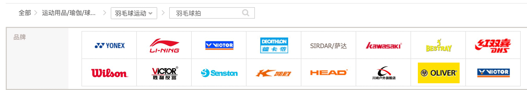 如我要换个羽毛球拍,某猫上羽毛球拍的品牌多达数十种,我想单独查看YONEX这个品牌的羽毛球拍;