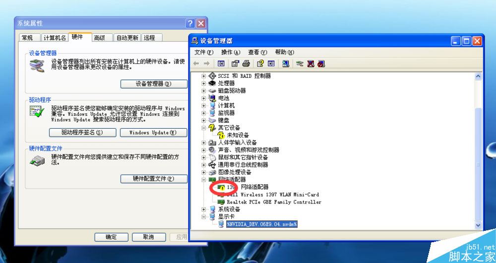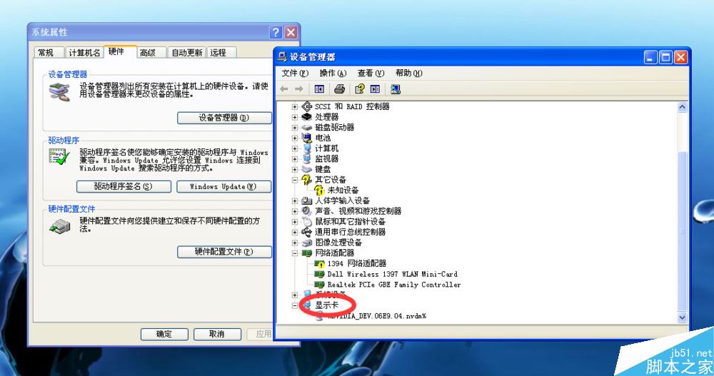 看一下显示卡条目下的名称是否出现问好或者叹号,例如图中这样的叹号。