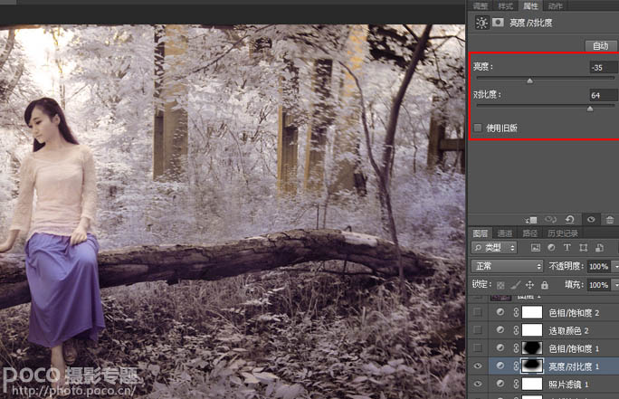12、亮度/对比度,降低亮度-35,增强对比度+64,用渐变工具在蒙板上拉出四角,使调整后的效果只出现在画面四个边角。