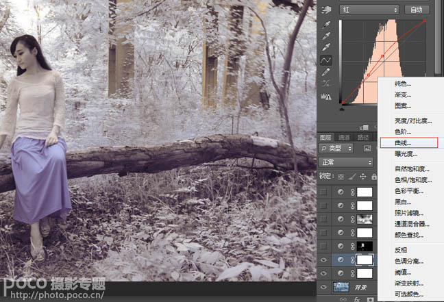 2、调整曲线营造偏紫色氛围,曲线调节层提亮红色通道。
