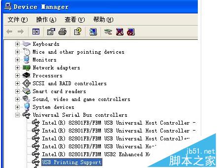 7、选择USB Printing Support 并点击下一步。点击安装程序并安装完毕后,点击完成。打开通用串行总线控制器,此时会在该项的下面出现USB Printing Support或者USB打印支持“端口。(如下图所示)