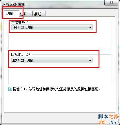 6、在出现的“IP筛选器 属性”对话框中,选择“地址”选项卡,“源地址”选择“任何”,“目标地址”选择“我的IP地址”; 选择“协议”选项卡,各项设置如图片中所示。设置好后点击“确定”。