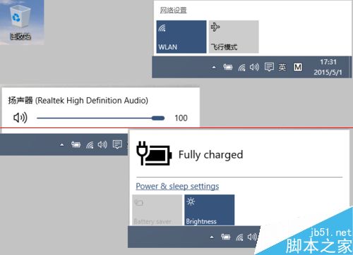 比如:新的回收站图标,新的网络、音量和电源弹出窗口等(依次如图),都更加醒目、更加方便操作,也更加 Continuum 化。