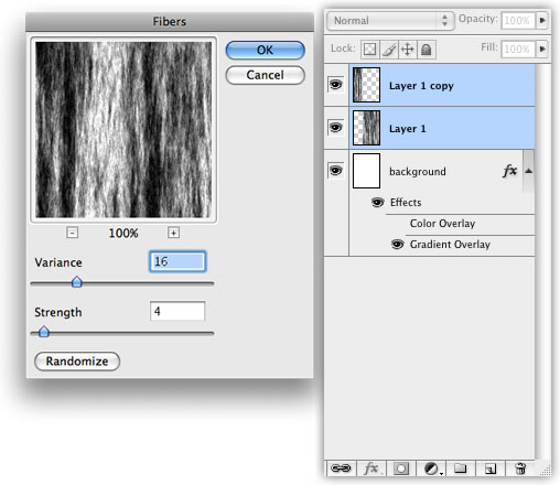 创建一个新层,填充黑色,然后改变混合模式为颜色减淡。然后滤镜>渲染>纤维。使用16和4的强度方差。