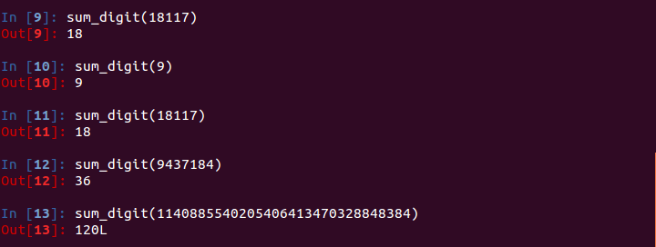 这样求一个数的数字之和的问题就被分解成了两部分:求除去最低位部分数字之和,然后加上最低位.这两个步骤全都比原问题要简单.这个函数是递归的,因为第一步的问题和原问题是相同类型的.也就是说,sum_digit的确实是我们需要去实现自然数数字求和的函数.