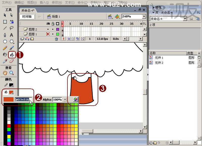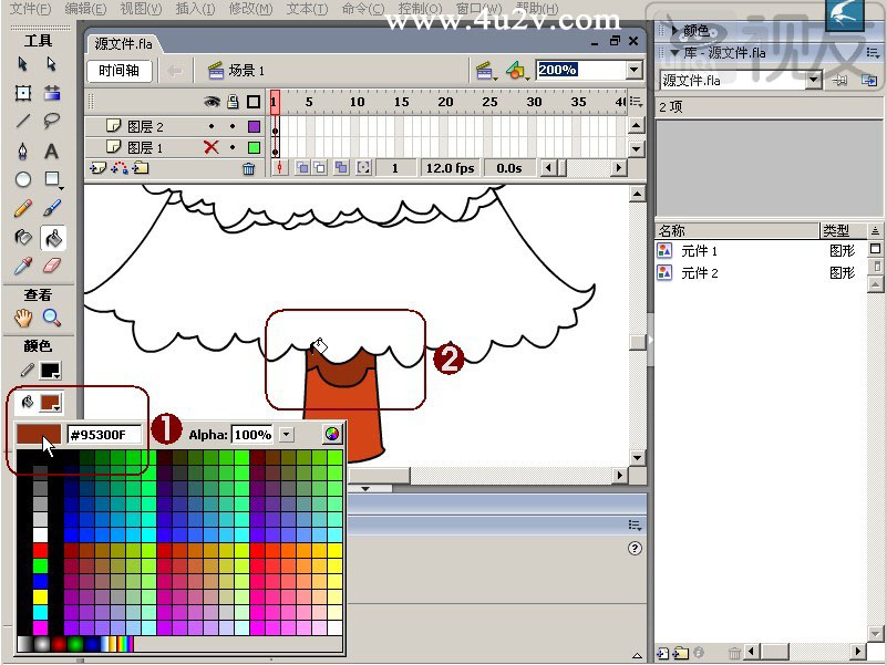 (5)设置“颜色”栏中“填充色”值为“#95300F”①,用鼠标单击填充树干上半部分②,如图5-10所示。