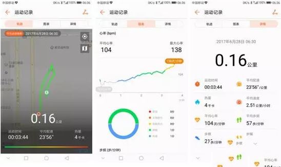 荣耀手环3在走路、跑步时,还可以绘制出运动路张,心率的折线统图和数据汇总。