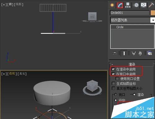 3、单击“创建”-“图形”-“样条线”-“圆”按钮,在“顶”视图创建一个圆形,设置“半径”为45;进入3DsMax2013“修改”命令面板,在“渲染”卷展栏下勾选“在渲染中启用”和“在视口中启用”复选框,设置“厚度为1.5,如图所示。