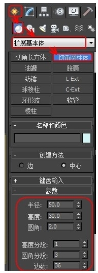 1、单击“创建”-“几何体”-“扩展基本体”-“切角圆柱体”按钮,在3DsMax2013“顶”视图创建一个切角圆柱体,设置参数如图所示。