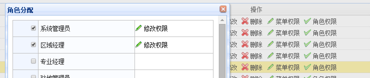 在菜单管理中我们就可以这样管理,某一菜单,那一角色可以看到就打上√这样比较容易控制。