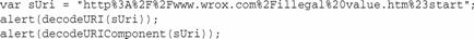 在这个例子中,变量uri存放的是用encodeURIComponent()编码的字符串。生成的值说明了应用两个解码方法时会发生的事情。第一个值由decodeURI()输出,把%20替换成空格。第二个值由decodeURIComponent()输出,替换所有的特殊。