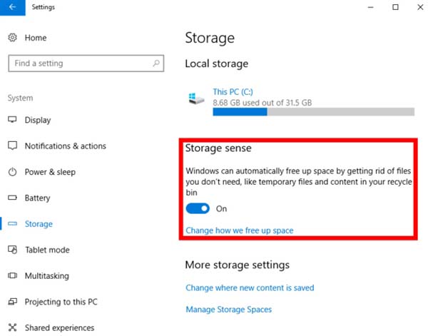 用户可以在“设置--系统--存储”下找到Storage Sense功能的开关。