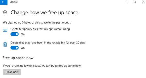 开启后用户还需要进一步的设置,总共也就两个功能,第一个选项是允许系统30天自动清空回收站,而第二个选项的具体意义不明,但猜测应该是能够自动清除C:\Temp文件夹下的临时文件。
