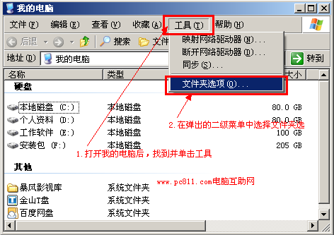 第2步:在打开我的电脑窗口中找到并单击工具栏中《工具>文件夹选项》窗口。