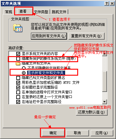 第3步:在打开的文件夹选项窗口中单击《查看》选项卡,在打开的查看选项卡中的高级设置下向下拉动,找到《隐藏受保护的操作系统文件、显示所有文件和文件夹》这两项,取消《隐藏受保护的操作系统文件》前面的勾,再单击选择“显示所有文件和文件夹”。
