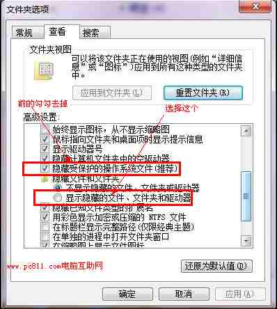 第2步:在打开的文件夹选项窗口中,找到并把《隐藏受保护的操作系统文件》前面的勾去掉,并选择《显示隐藏的文件、文件夹和驱动器》此项。