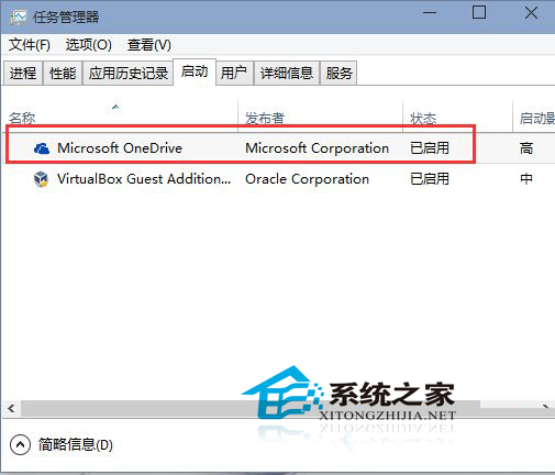 2、然后切换到“启动”选项卡中,我们可以看到在启动项目中有一个“MicroSoft OneDrvie”,选项该项,然后点击“禁用”按钮。