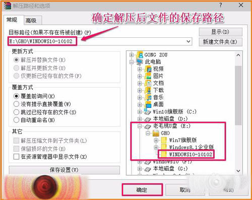 在解压路径和选项窗口,我们确定解压后文件的保存路径为:E:\GHO\Windows10-10102(已经制作好U盘启动器的U盘),再点击:确定;