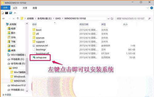 压缩文件解压完成后,我们打开U盘GHO文件夹再点击 打开Windows10-10102系统镜像文件,(1)在打开的文件中左键点击:setup.exe文件即可以安装系统;(2)重新启动计算机用U盘安装的方法安装系统。