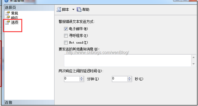 如下图所示,可以设定警报错误发送的方式,可以选择[E-mail]、[Pager]、[Net send]复选框(可多选),同时可以填写在发送警报的同时给出的通知消息,并能够对响应的间隔时间进行设定。
