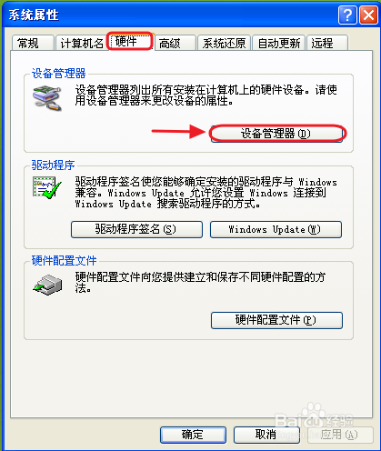 在“系统属性”界面,选择“硬件”选项卡,点击下方“设备管理器”按钮,打开“设备管理器”。