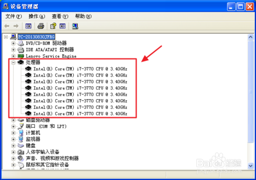 在“设备管理器”界面,单击“处理器”,展开子行,在下方会显示多个子行,有几个子行就代表你的电脑属于几核。图中显示这台电脑属于八核电脑。